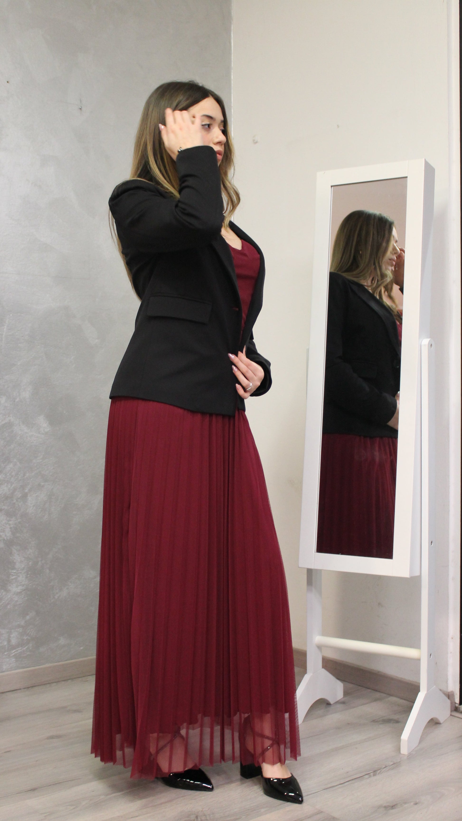 Abito colore vinaccio con corpetto strutturato e gonna plissé.