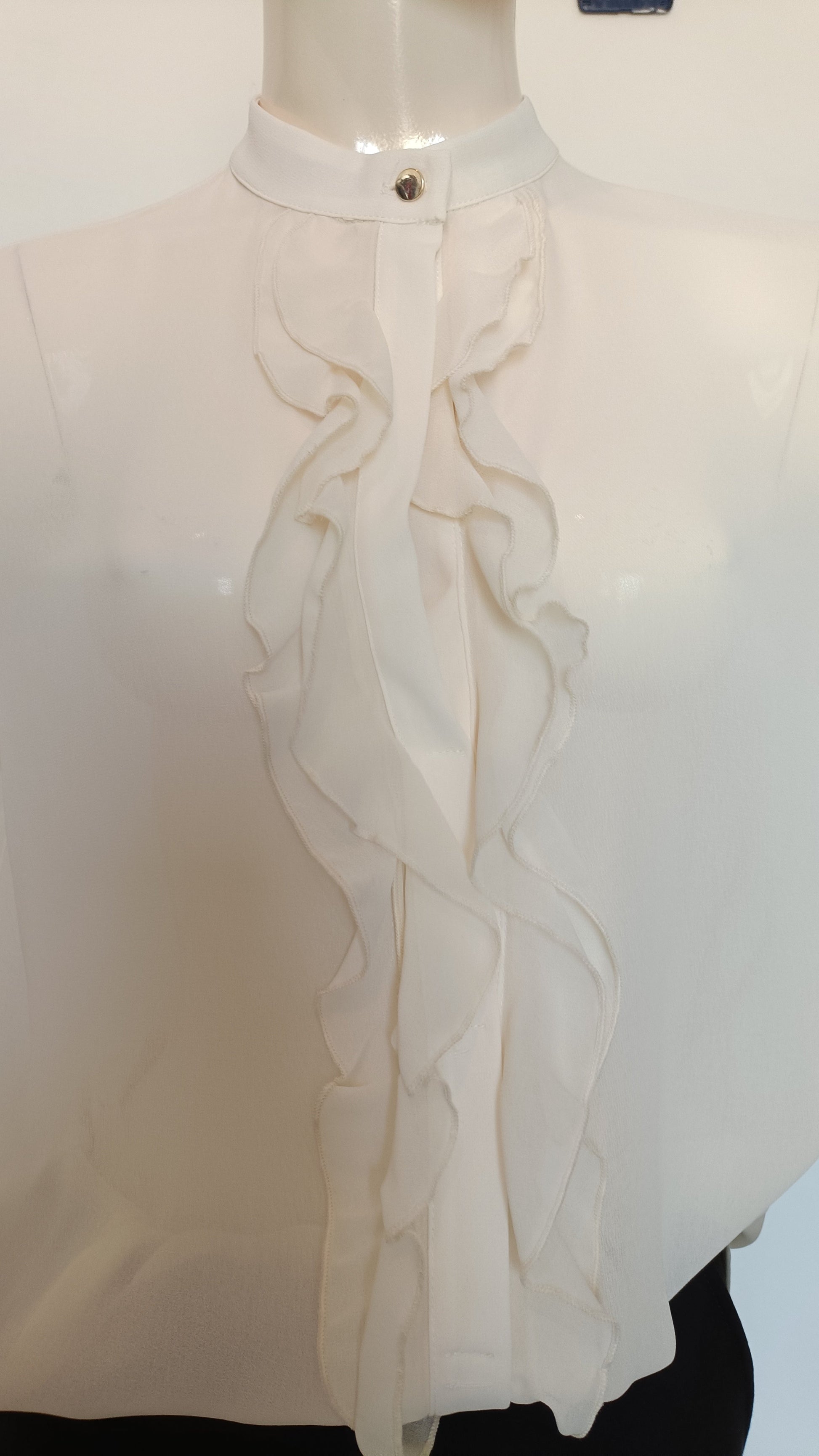 Camicia in georgette colore crema , con volant lungo l’abbottonatura e colletto alla coreana. Aggiunge un tocco romantico e luminoso il bottone colore oro.