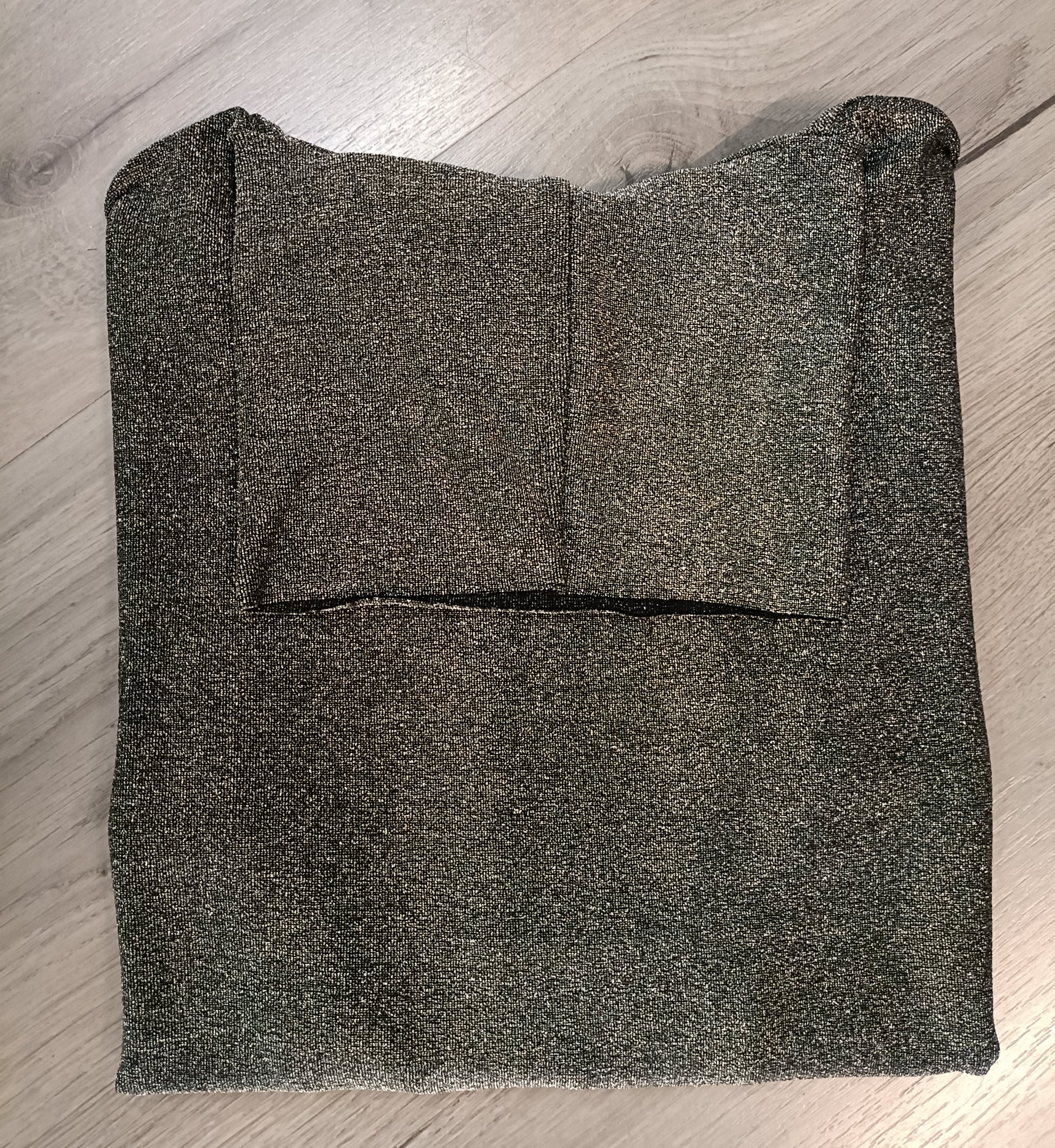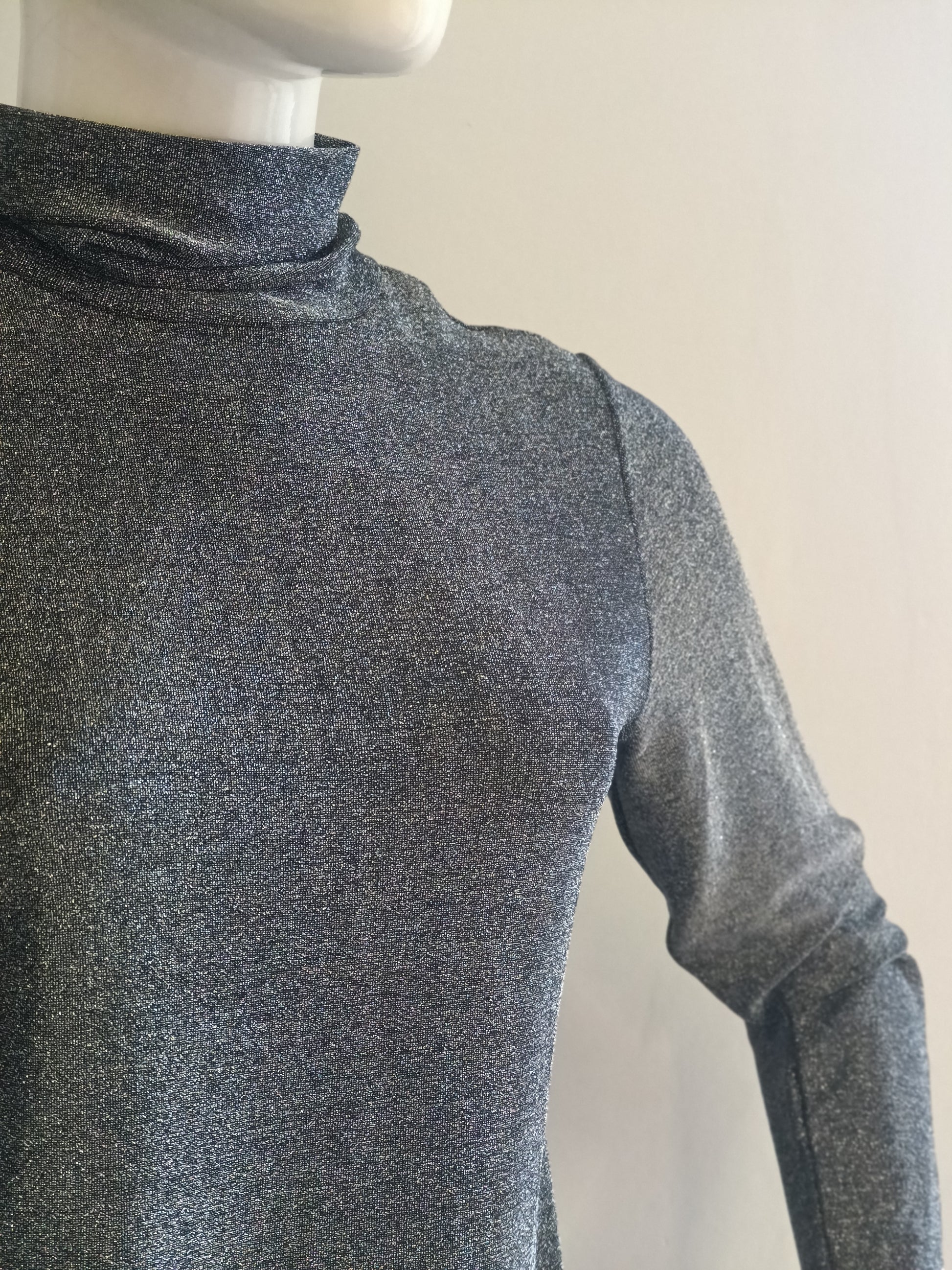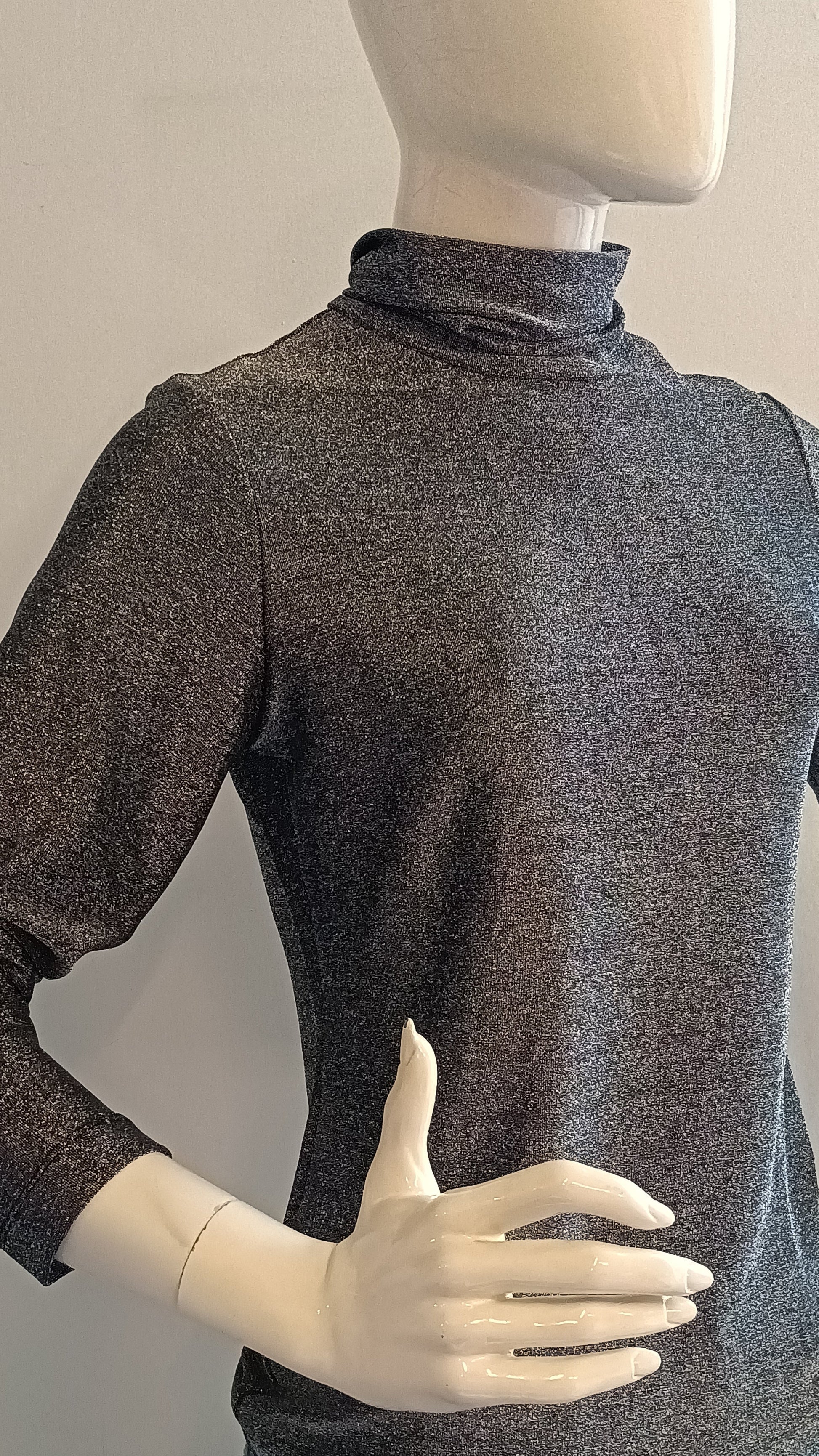 Maglia a lupetto in lurex con maniche lunghe. Tessuto effetto brillante dona un aspetto leggermente metallizzato. Colore grigio scuro/antracite con una leggera luminosità. Vestibilità aderente ma confortevole, con collo alto morbido che cade leggermente.