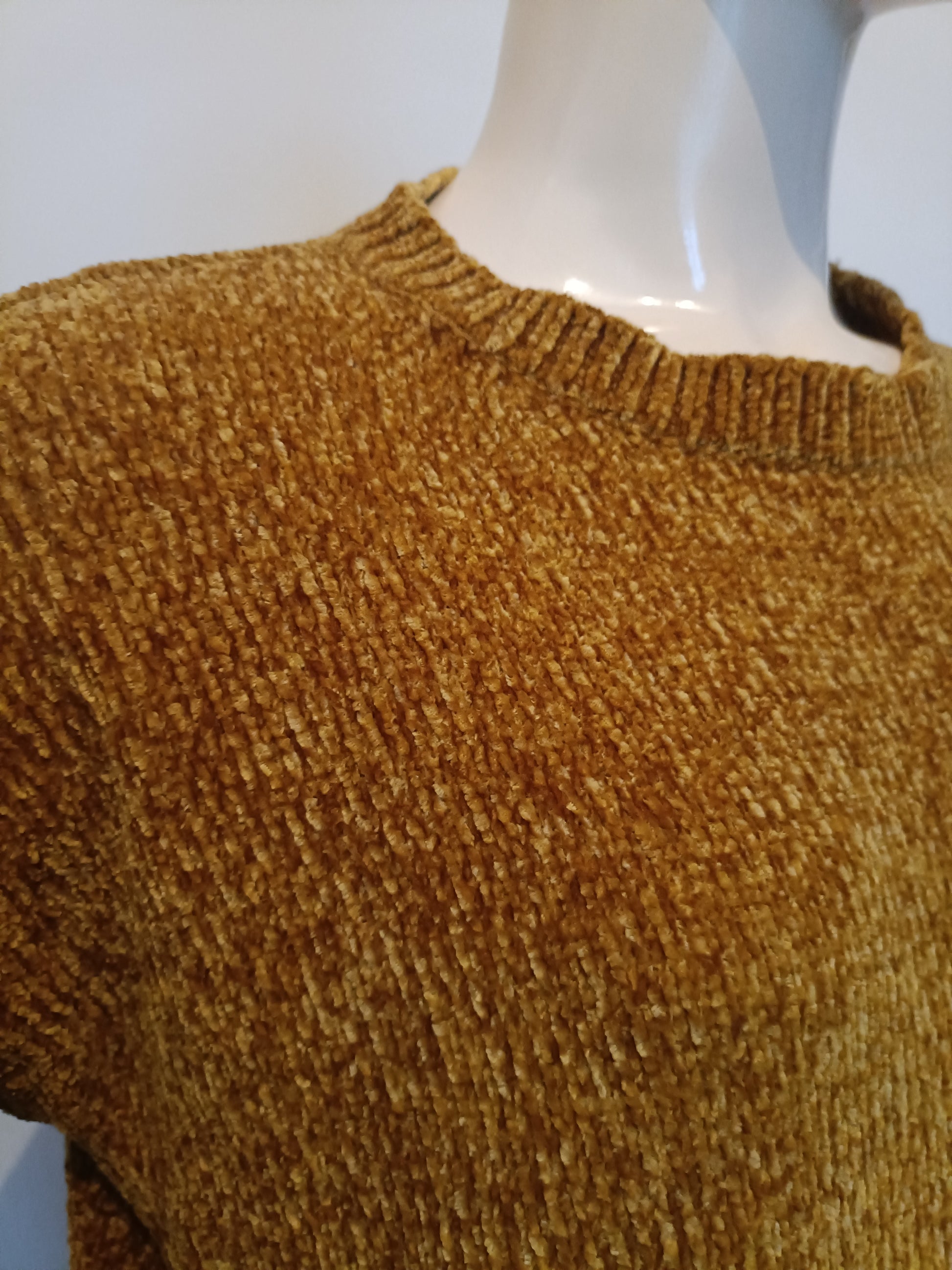 Maglioncino in ciniglia color ocra, caldo e raffinato, ideale per un look sportivo ma anche ricercato.